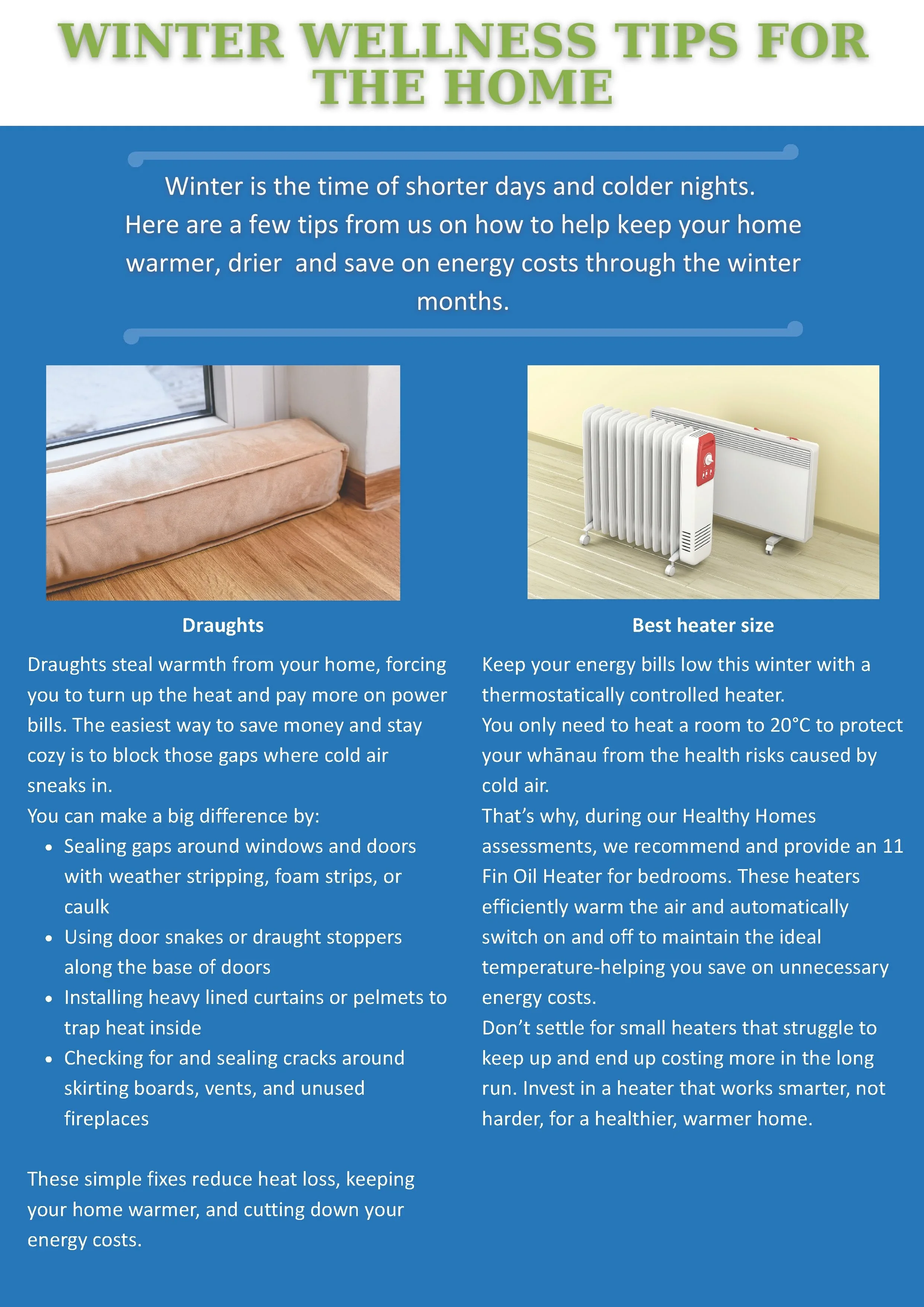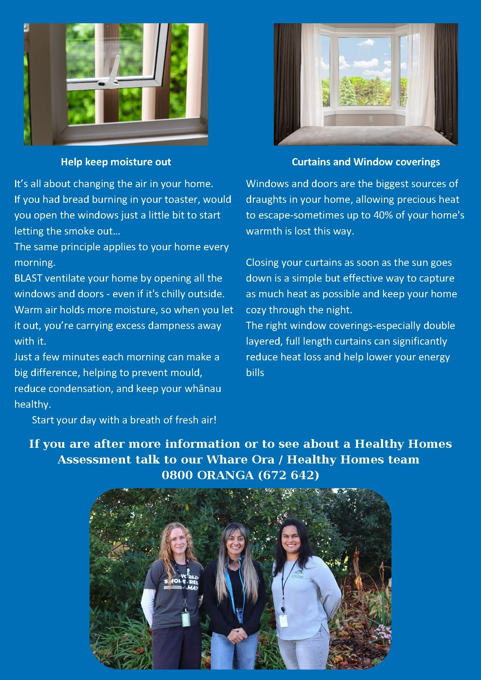 This winter, the Whare Ora team in Wairau /Marlborough have collated a set of practical, achievable tips to help whānau keep their homes warmer and drier. In turn, whānau can save on energy costs.